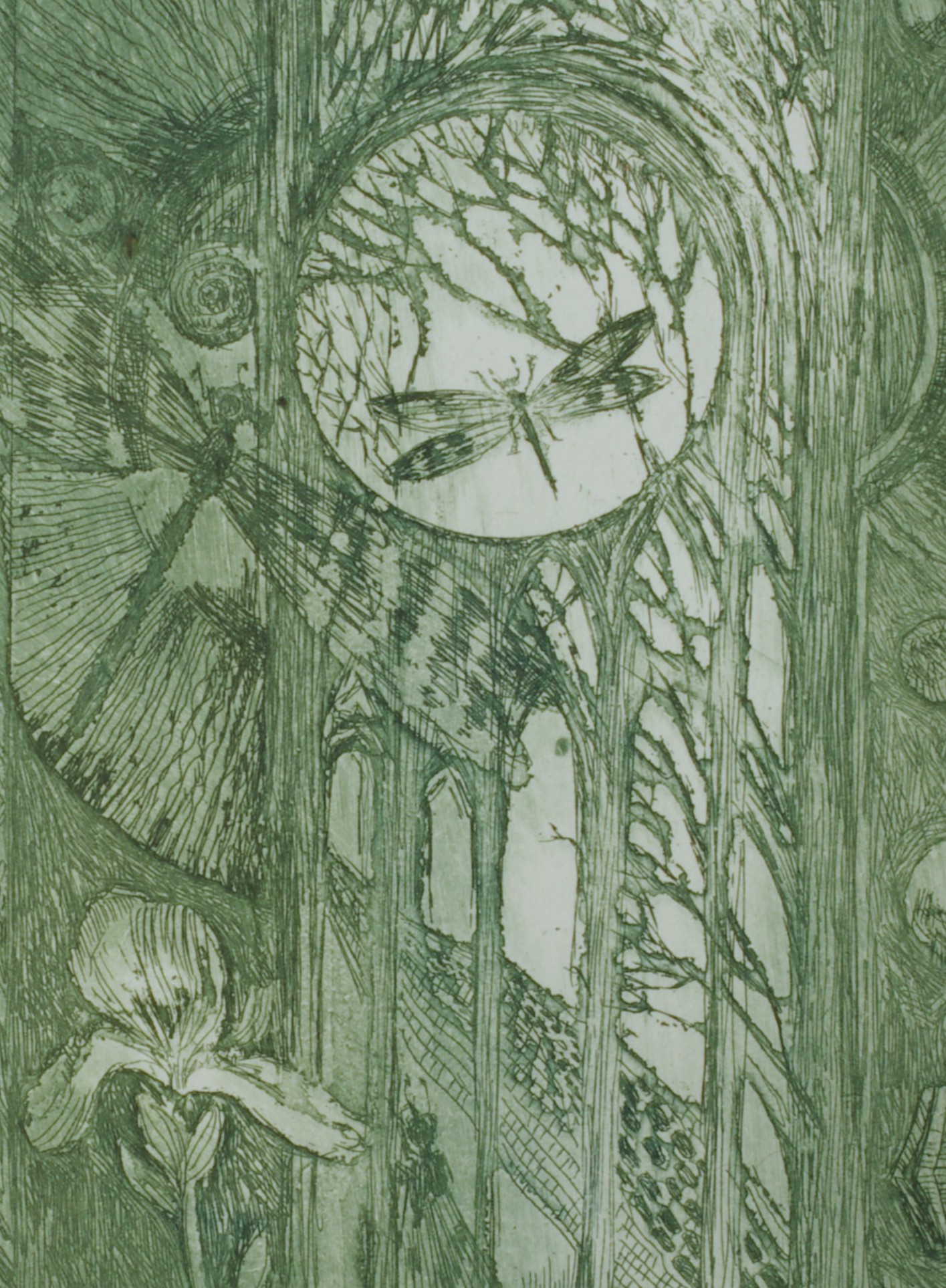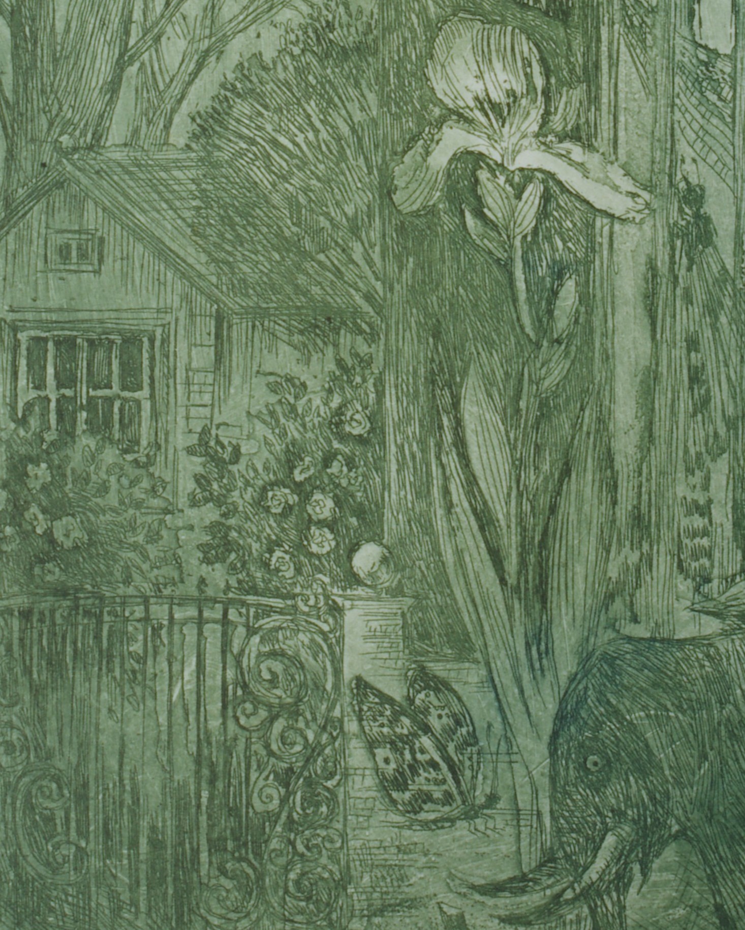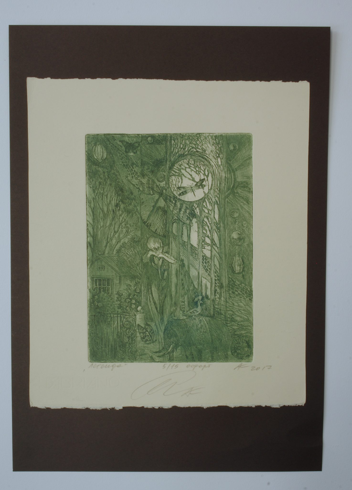 Legend is a finely detailed etching by Alla Kolpakova that invites the viewer into a dreamlike, symbolic world. Executed in delicate green tones, the composition unfolds as a layered narrative: a mysterious garden, a solitary house, and elongated, almost ethereal figures coexist with animals and celestial forms. At the center, a circular motif resembling a moon or portal draws the eye, suggesting a passage between realities—memory and myth, nature and imagination.