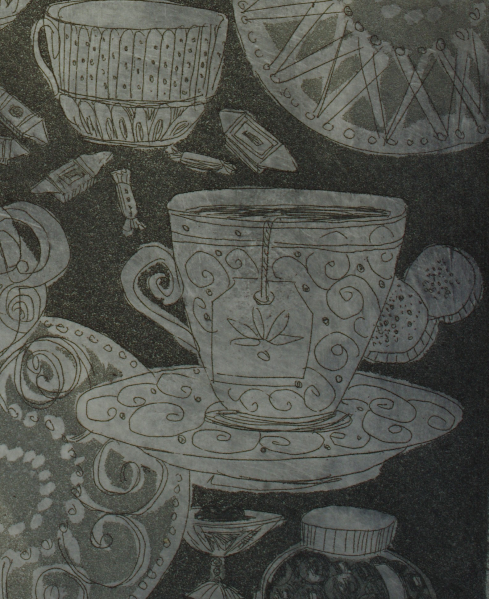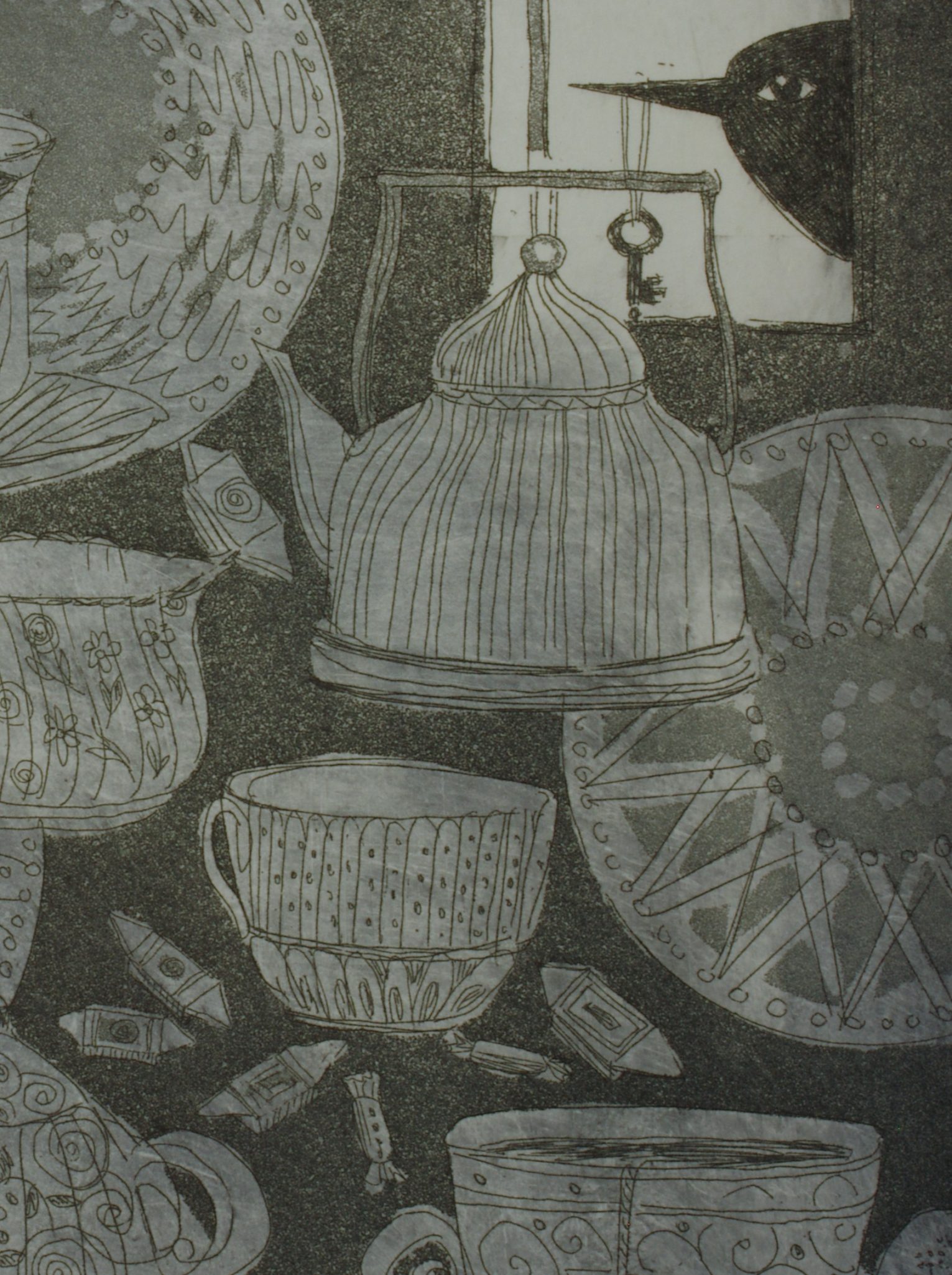 A richly ornamented still life unfolds as a rhythmic interplay of delicate porcelain forms—cups, teapots, plates, and vessels—layered into a dense, almost musical composition. Intricate patterns and fine linear textures emphasize the fragility and elegance of each object, while the dark background creates a sense of depth and quiet intimacy. Subtle narrative elements, including a watchful bird and scattered sweets, introduce a hint of surreal tension, transforming the familiar into something poetic and slightly enigmatic. The work celebrates the beauty of everyday objects, elevating them into a refined, decorative harmony balanced between order and spontaneity.
