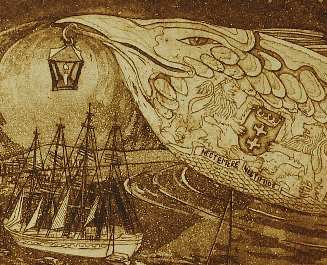 “Nec temere, nec timide” (“Neither rashly nor timidly”). Fine graphics, a fantastical seascape, and rich symbolism create an atmosphere of mysterious, almost fairy-tale-like arrival in an unfamiliar harbor.